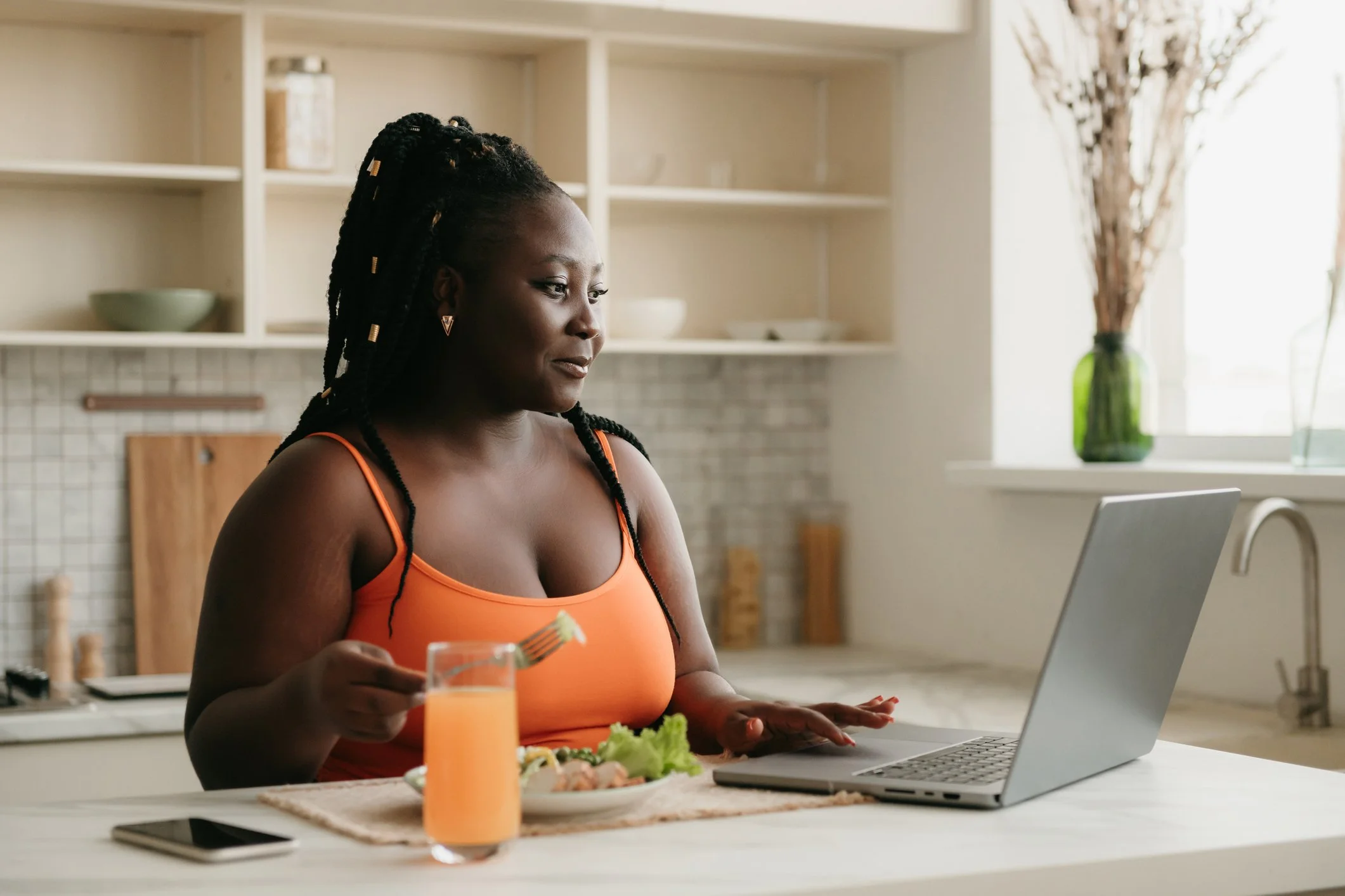 Woman eating a balanced meal while on a laptop, representing virtual eating disorder therapy and support.